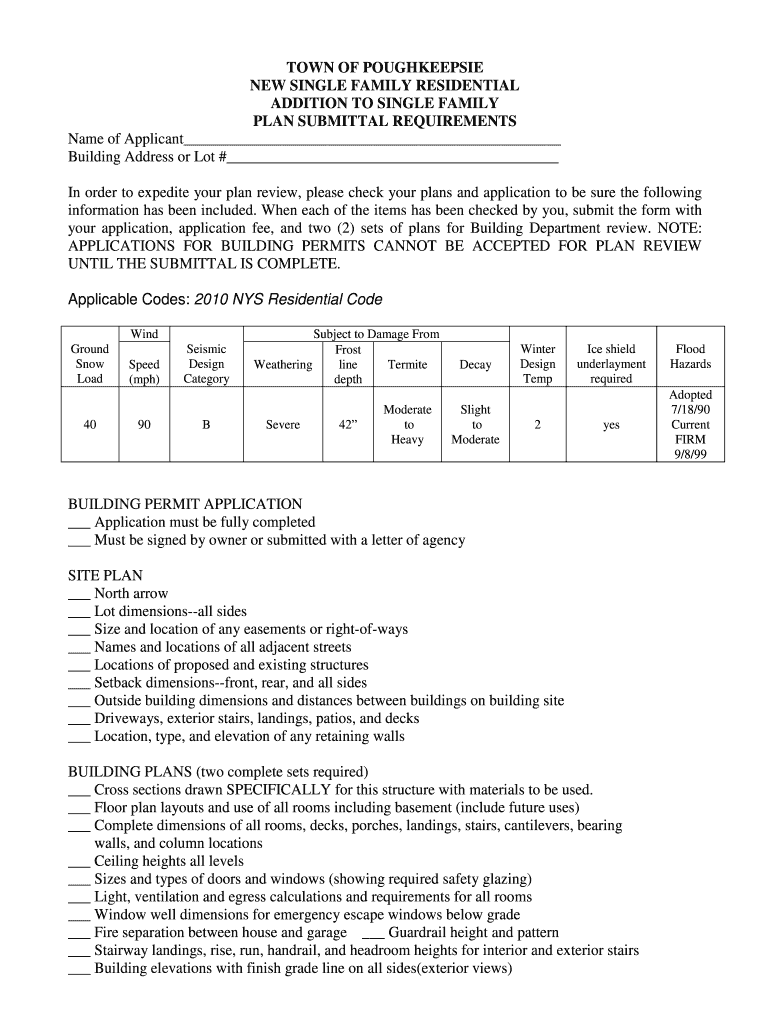 TOWN OF POUGHKEEPSIE NEW SINGLE FAMILY RESIDENTIAL ADDITION TO SINGLE FAMILY PLAN SUBMITTAL REQUIREMENTS Name of Applicant Building Address or Lot # In order to expedite your plan review, please check