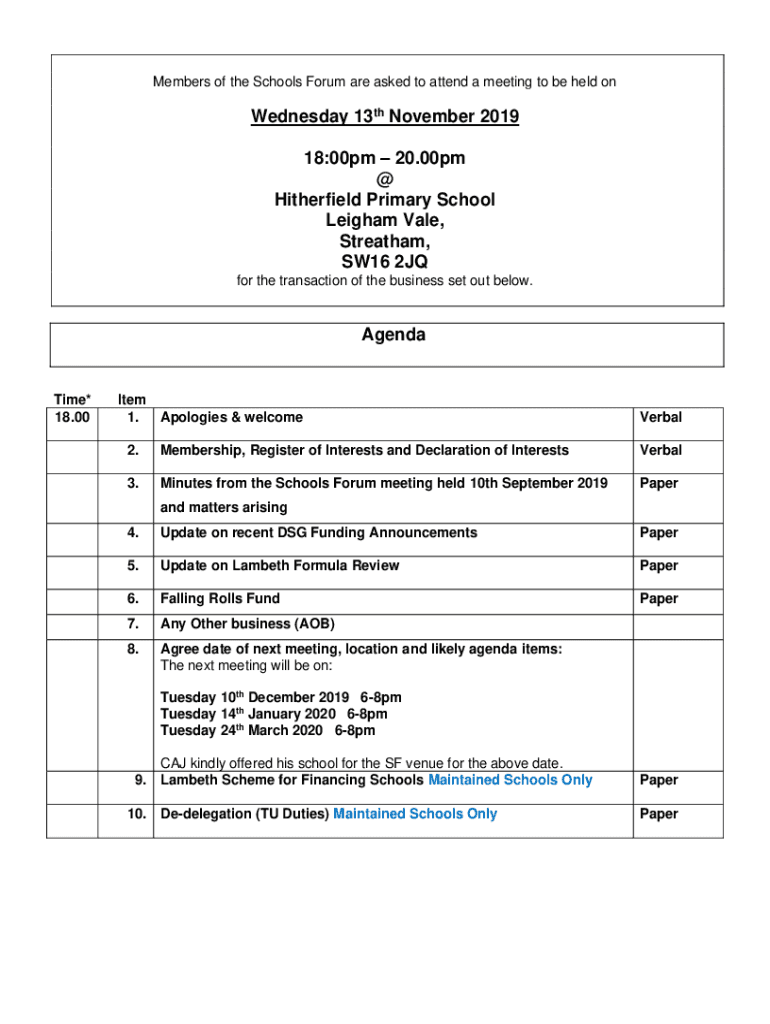 Members of the Schools Forum are asked to attend a meeting to be held on Wednesday 13th November 2019 18:00pm 20.00pm @ Hither field Primary School Latham Vale, Stream, SW16 2JQ for the transaction