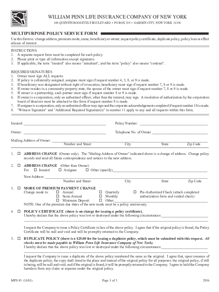 WILLIAM PENN LIFE INSURANCE COMPANY OF NEW YORK 100 QUENTIN ROOSEVELT BOULEVARD PO BOX 519 GARDEN CITY, NEW YORK 11530MULTIPURPOSE POLICY SERVICE FORM Use this form to: change address, premium mode,