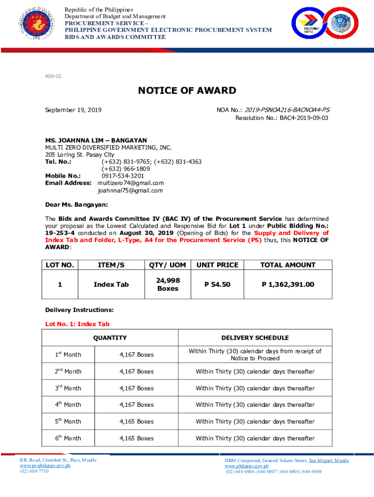 Republic of the Philippines Department of Budget and Management PROCUREMENT SERVICE PHILIPPINE GOVERNMENT ELECTRONIC PROCUREMENT SYSTEM BIDS AND AWARDS COMMITTEEA0902NOTICE OF AWARD NOA No.: 2019PSNOA