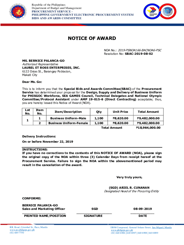 Republic of the Philippines Department of Budget and Management PROCUREMENT SERVICE PHILIPPINE GOVERNMENT ELECTRONIC PROCUREMENT SYSTEM BIDS AND AWARDS COMMITTEENOTICE OF AWARD NOA No.: 2019PSNOA166BACNOA6PSC