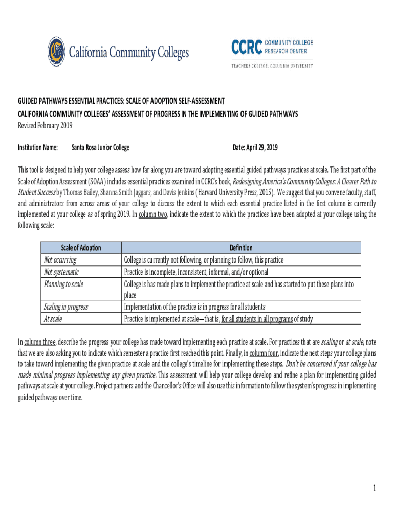 GUIDED PATHWAYS ESSENTIAL PRACTICES: SCALE OF ADOPTION REASSESSMENT CALIFORNIA COMMUNITY COLLEGES ASSESSMENT OF PROGRESS IN THE IMPLEMENTING OF GUIDED PATHWAYS Revised February 2019 Institution Name:Santa