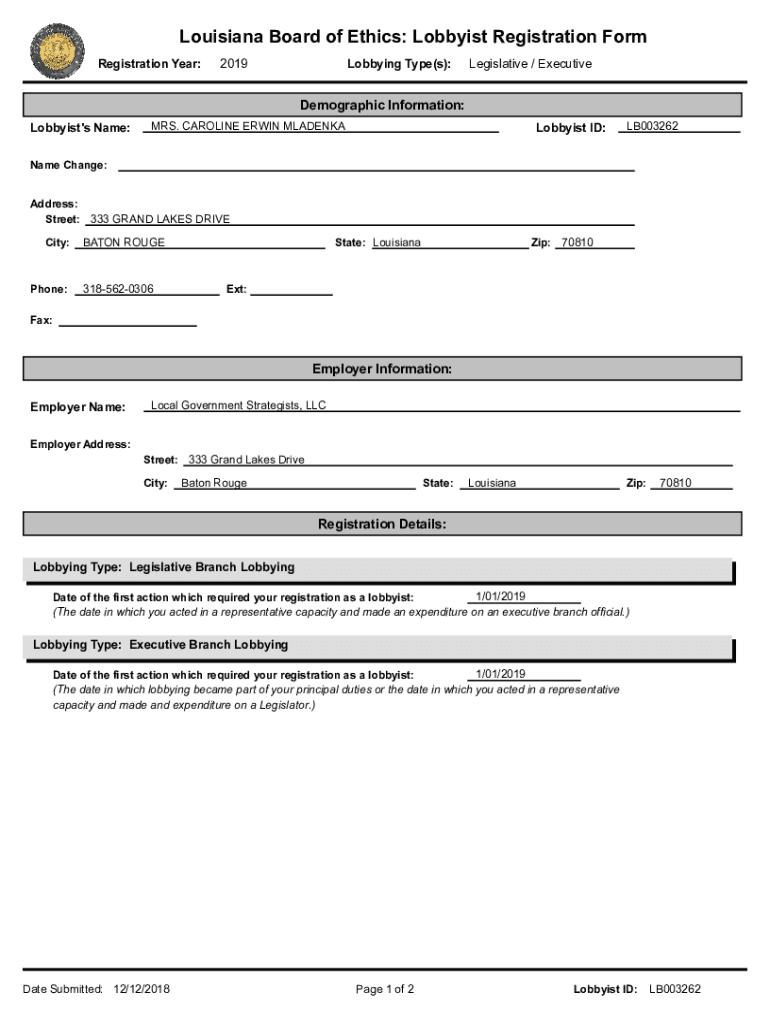 Louisiana Board of Ethics: Lobbyist Registration Form Registration Year:Lobbying Type(s):2019Legislative / ExecutiveDemographic Information: Lobbyist\'s Name:MRS. CAROLINE ERWIN MLADENKALobbyist ID:LB003262Name