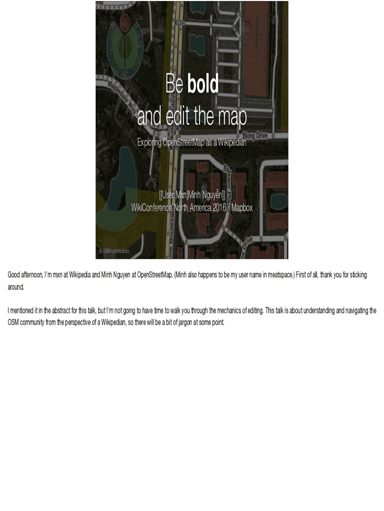 Be bold and edit the map Exploring OpenStreetMap as a Wikipedia [[User:MXN|Mind Nguyen]] WikiConference North America 2016 / Mapbox OSM contributors1Good afternoon, I'm MXN at Wikipedia and Mind Nguyen