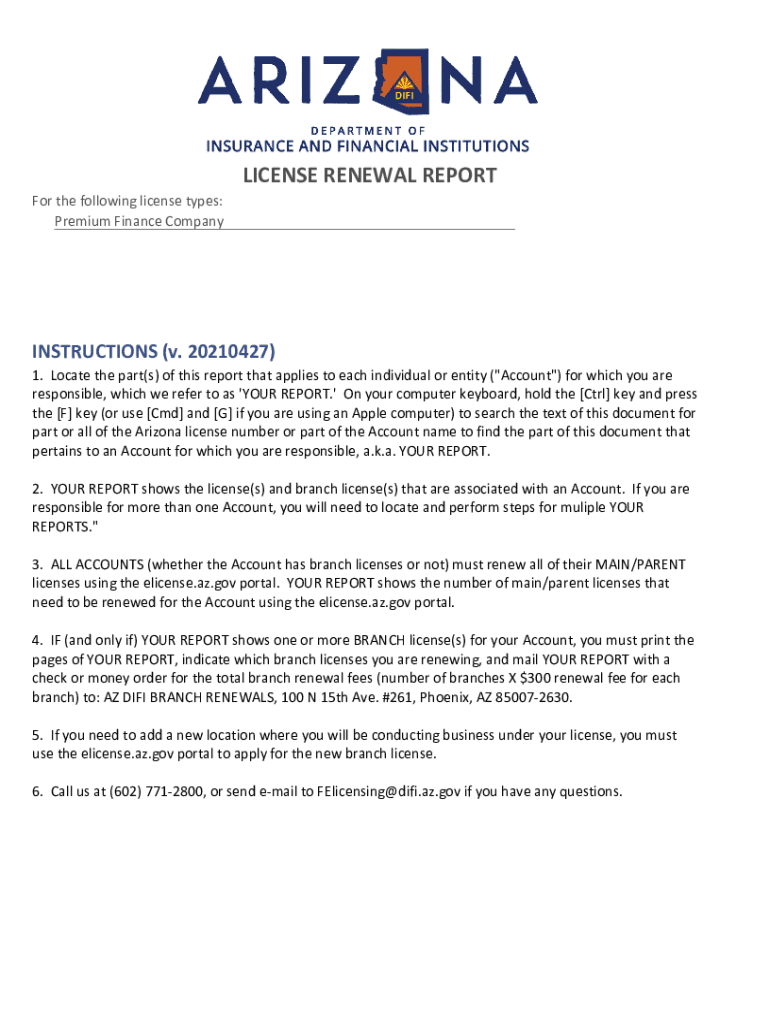 LICENSERENEWALREPORT Forthefollowinglicensetypes: PremiumFinanceCompanyINSTRUCTIONS(v.20210427) 1. Locatethepart(s)ofthisreportthatappliestoeachindividualorentity(\” Account\”)forwhichyouare responsible,