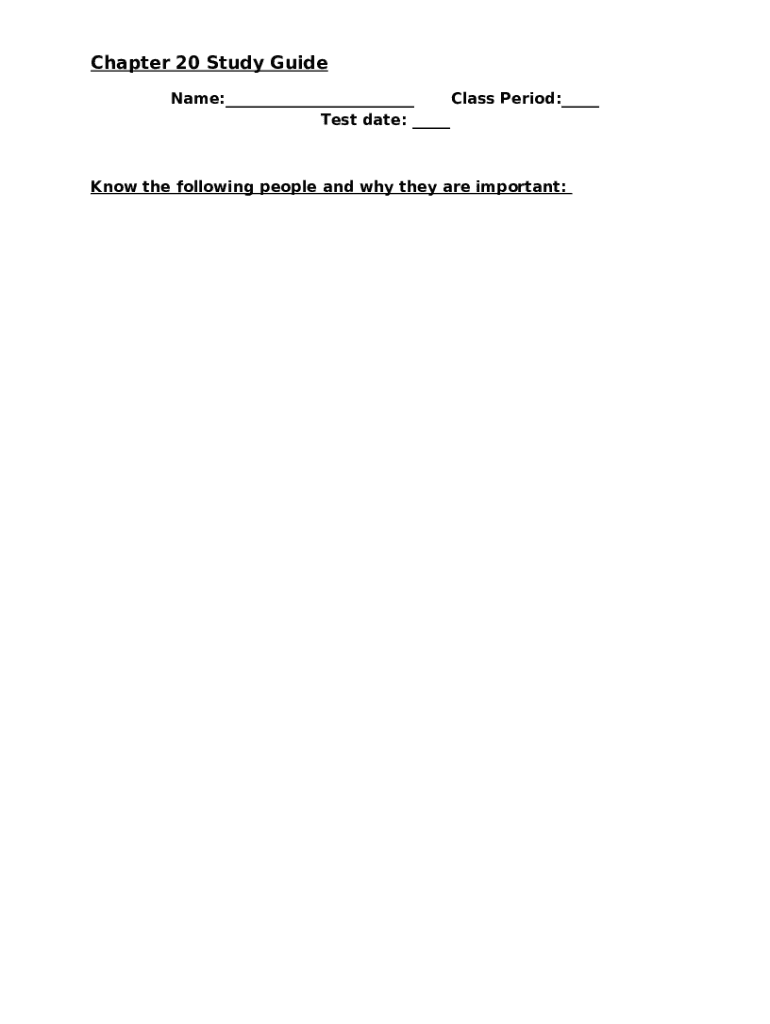 The quizlet.com684182906chapter-20-study-guideChapter 20 Study Guide FlashcardsQuizlet is a Word document that should be submitted to the required address to provide some info. It needs to be filled-out and signed, which may be done in hard copy, or with the help of a particular software like PDFfiller. This tool lets you fill out any PDF or Word document directly in your browser, customize it according to your needs and put a legally-binding e-signature. Right away after completion, the user can easily send the quizlet.com684182906chapter-20-study-guideChapter 20 Study Guide FlashcardsQuizlet to the appropriate individual, or multiple recipients via email or fax. The blank is printable too due to PDFfiller feature and options offered for printing out adjustment. In both electronic and in hard copy, your form will have a clean and professional appearance. It's also possible to save it as the template to use it later, there's no need to create a new file over and over. You need just to edit the ready sample.