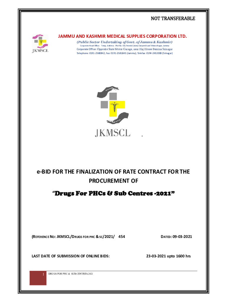 NOT TRANSFERABLE JAMMY AND KASHMIR MEDICAL SUPPLIES CORPORATION LTD. (Public Sector Undertaking of Govt. of Jammy & Kashmir) Corporate Head Office: Temp. Address Plot No. 58, Friends Colony Sat yam