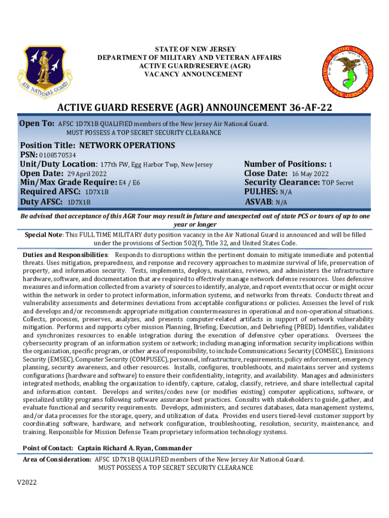 STATE OF NEW JERSEY DEPARTMENT OF MILITARY AND VETERAN AFFAIRS ACTIVE GUARD/RESERVE (AGR) VACANCY ANNOUNCEMENTACTIVE GUARD RESERVE (AGR) ANNOUNCEMENT 36AF22 Open To:AFC 1D7X1B QUALIFIED members of