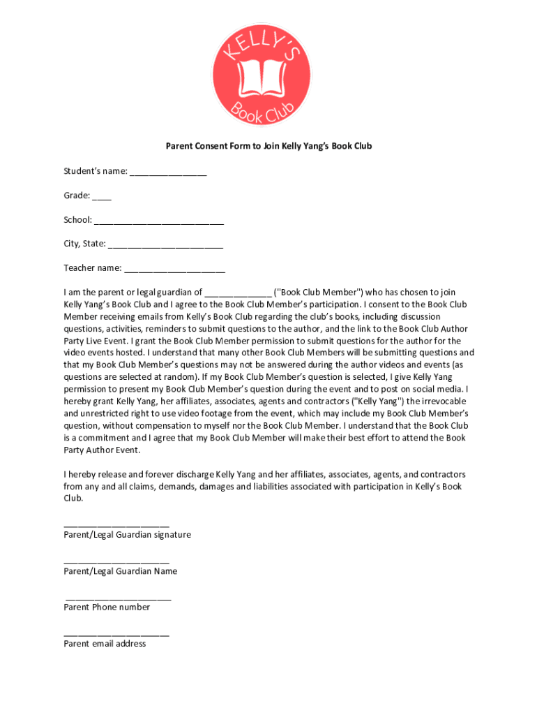 Parent Consent Form to Join Kelly Yang's Book Club Students name: ___ Grade: ___ School: ___ City, State: ___ Teacher name: ___ I am the parent or legal guardian of ___ (\” Book Club Member\”)