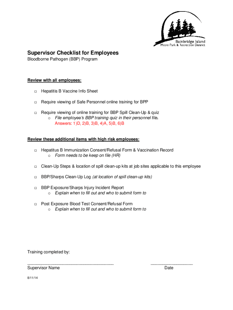 Supervisor Checklist for Employees Blood-borne Pathogen (BBP) ProgramReview with all employees: Hepatitis B Vaccine Info SheetRequire viewing of Safe Personnel online training for Require viewing