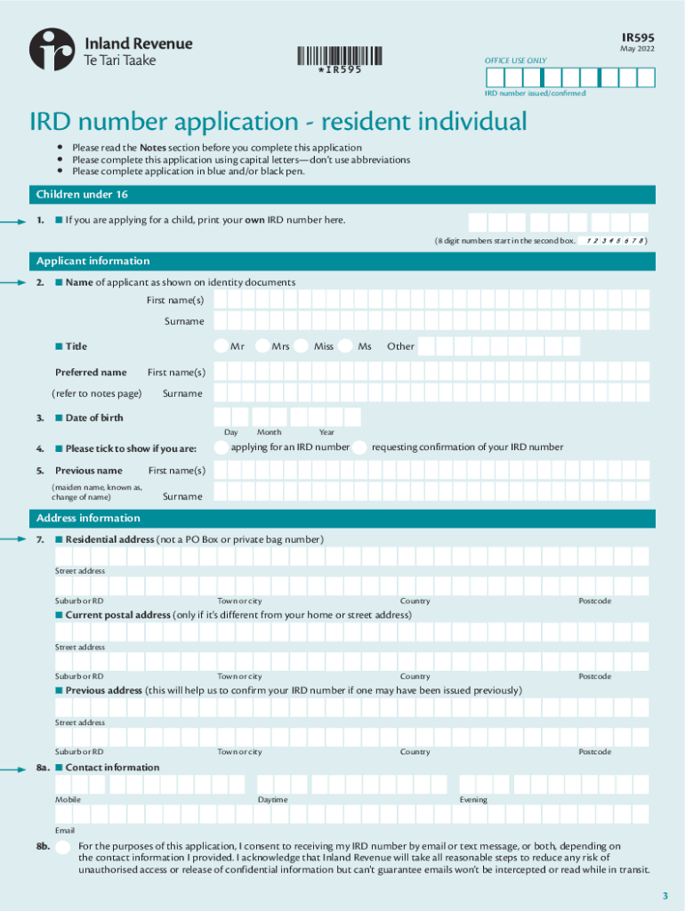 IR595June 2022IRD number application resident individual Complete this form unless you are a nonresident or an offshore person (see notes page). If you are, use the IRD number application nonresident/offshore