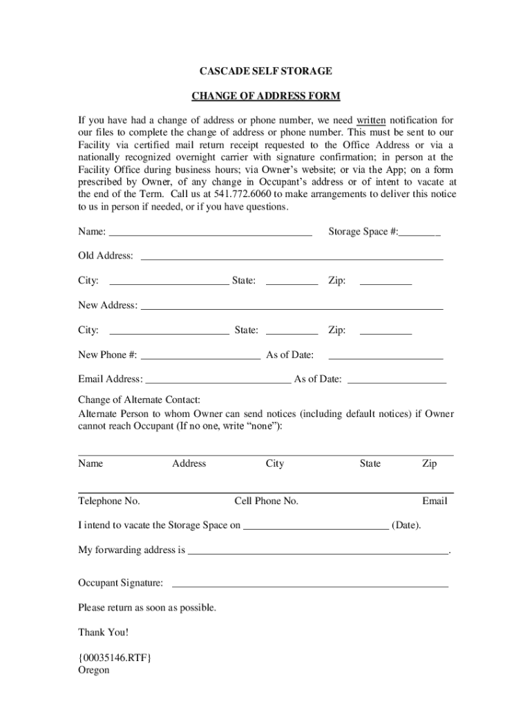 CASCADE SELF STORAGE CHANGE OF ADDRESS FORM If you have had a change of address or phone number, we need written notification for our files to complete the change of address or phone number. This