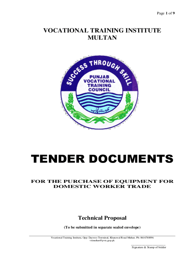 Page 1 of 9VOCATIONAL TRAINING INSTITUTE MULTANTENDER DOCUMENTS FOR THE PURCHASE OF EQUIPMENT FOR DOMESTIC WORKER TRADETechnical Proposal (To be submitted in separate sealed envelope) Vocational Training