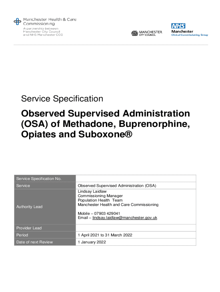 Service SpecificationObserved Supervised Administration (OSA) of, Opiates and SuboxoneService Specification No. ServiceAuthority LeadObserved Supervised Administration (OSA) Lindsay Laid law Commissioning