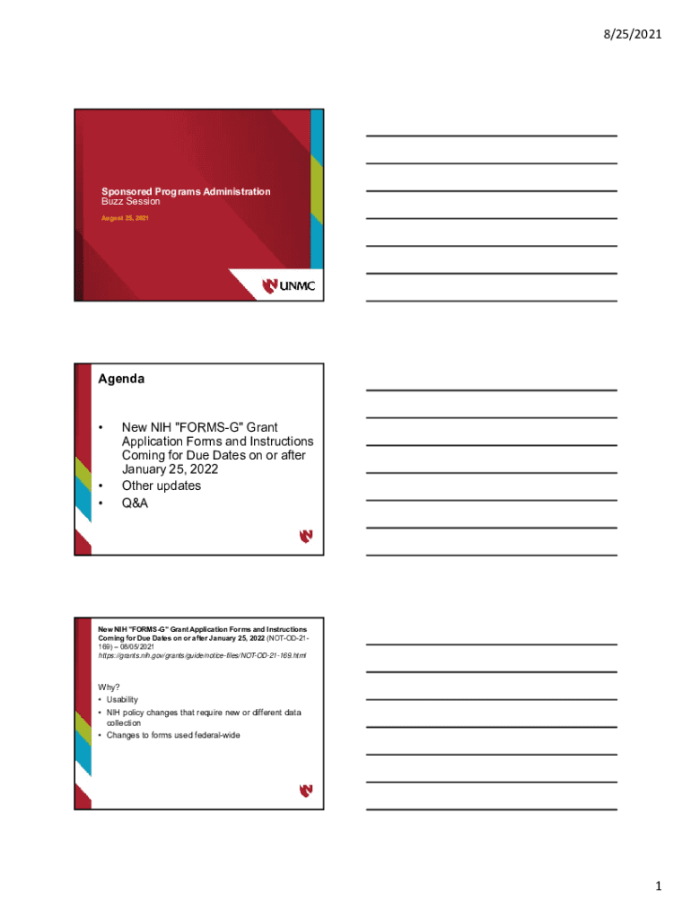 8/25/2021Sponsored Programs Administration Buzz Session August 25, 2021Agenda New NIH \” FORMS\” Grant Application Forms and Instructions Coming for Due Dates on or after January 25, 2022, Other