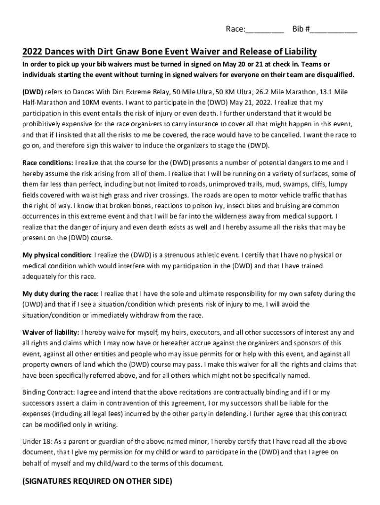 Race:___ Bib #___2022 Dances with Dirt Gnaw Bone Event Waiver and Release of Liability In order to pick up your bib waivers must be turned in signed on May 20 or 21 at check in. Teams or individuals