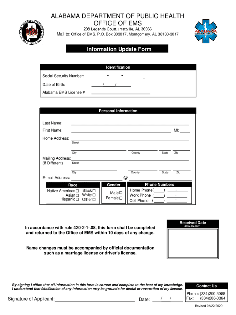 ALABAMA DEPARTMENT OF PUBLIC HEALTH OFFICE OF EMS 208 Legends Court, Prattville, AL 36066Mail to: Office of EMS, P.O. Box 303017, Montgomery, AL 361303017Information Update Form IdentificationSocial