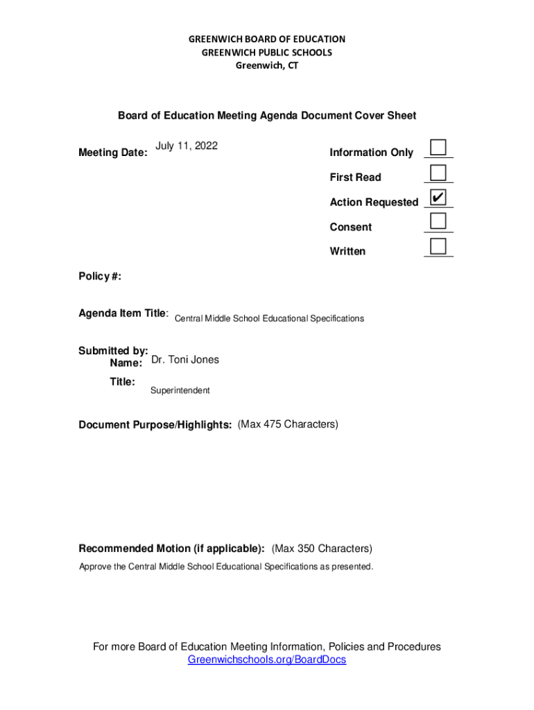 GREENWICH BOARD OF EDUCATION GREENWICH PUBLIC SCHOOLS Greenwich, Board of Education Meeting Agenda Document Cover SheetMeeting Date:July 11, 2022Information Only ___ First Read___ Action Requested