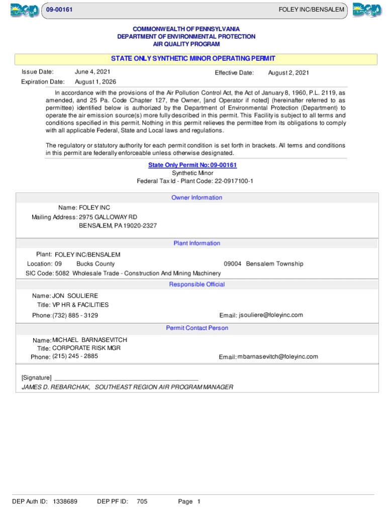0900161FOLEY INC/BENSALEM COMMONWEALTH OF PENNSYLVANIA DEPARTMENT OF ENVIRONMENTAL PROTECTION AIR QUALITY PROGRAMSTATE ONLY SYNTHETIC MINOR OPERATING PERMIT Issue Date:June 4, 2021Expiration Date:August