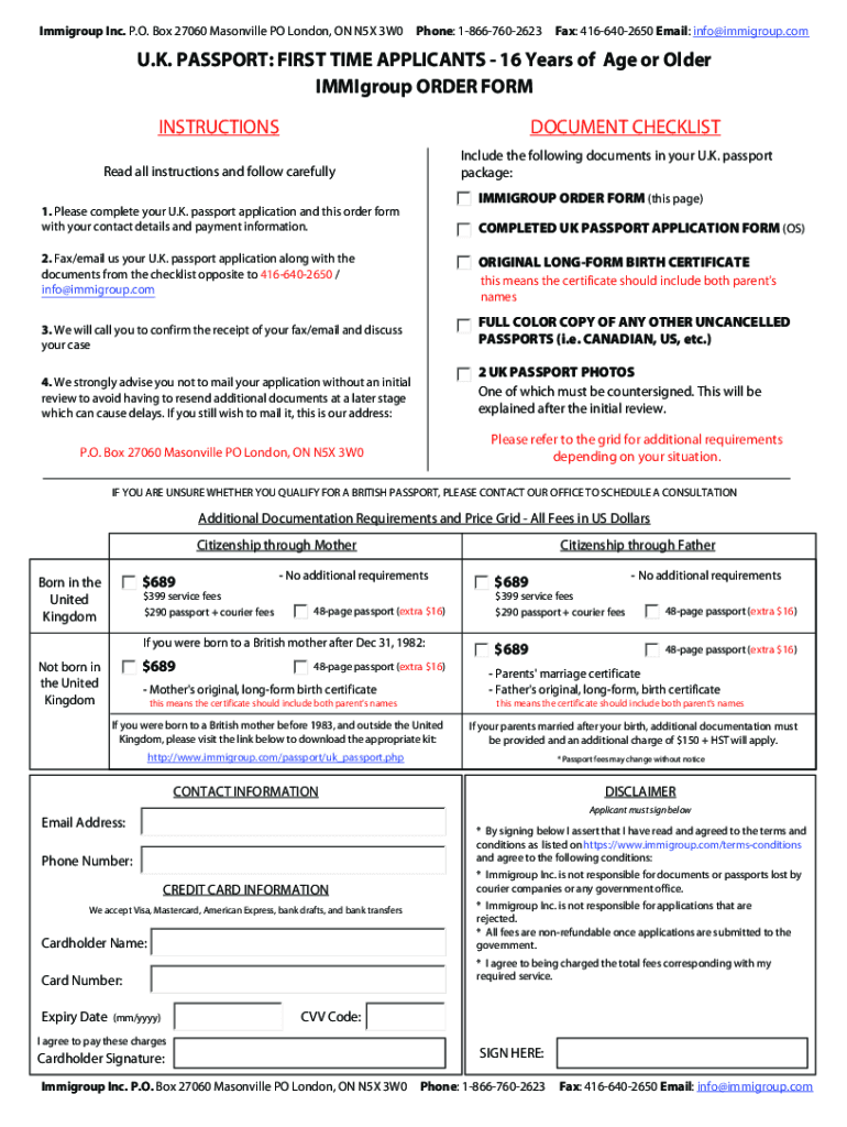 Semigroup Inc. P.O. Box 27060 Watsonville PO London, ON N5X 3W0Phone: 18667602623Fax: 4166402650 Email: info@immigroup.comU. K. PASSPORT: FIRST TIME APPLICANTS 16 Years of Age or Older