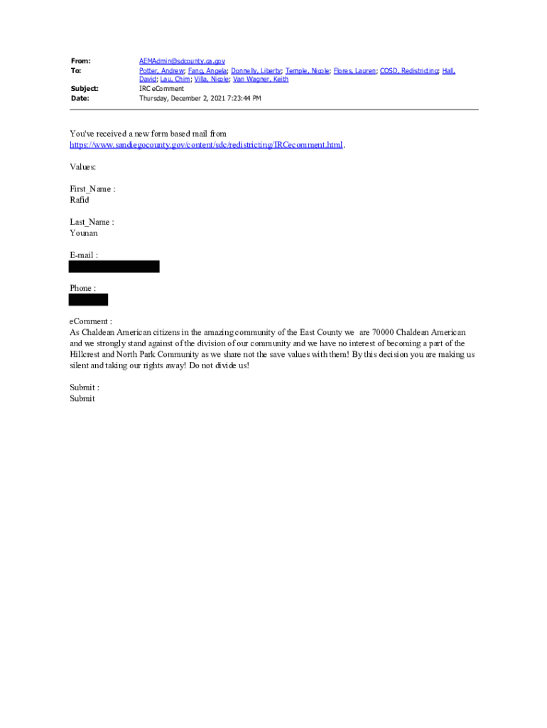 From: To: Subject: Date:AEMAdmin@sdcounty.ca.gov Potter, Andrew; Fang, Angela; Donnelly, Liberty; Temple, Nicole; Flores, Lauren; COST, Redistricting; Hall, David; LAU, Him; Villa, Nicole; Van Wagner,