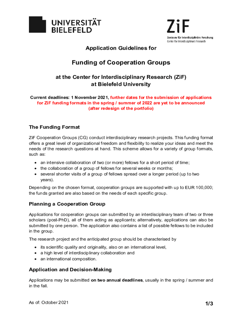 Application Guidelines founding of Cooperation Groups at the Center for Interdisciplinary Research (ZIF) at Bielefeld University Current deadlines: 1 November 2021, further dates for the submission