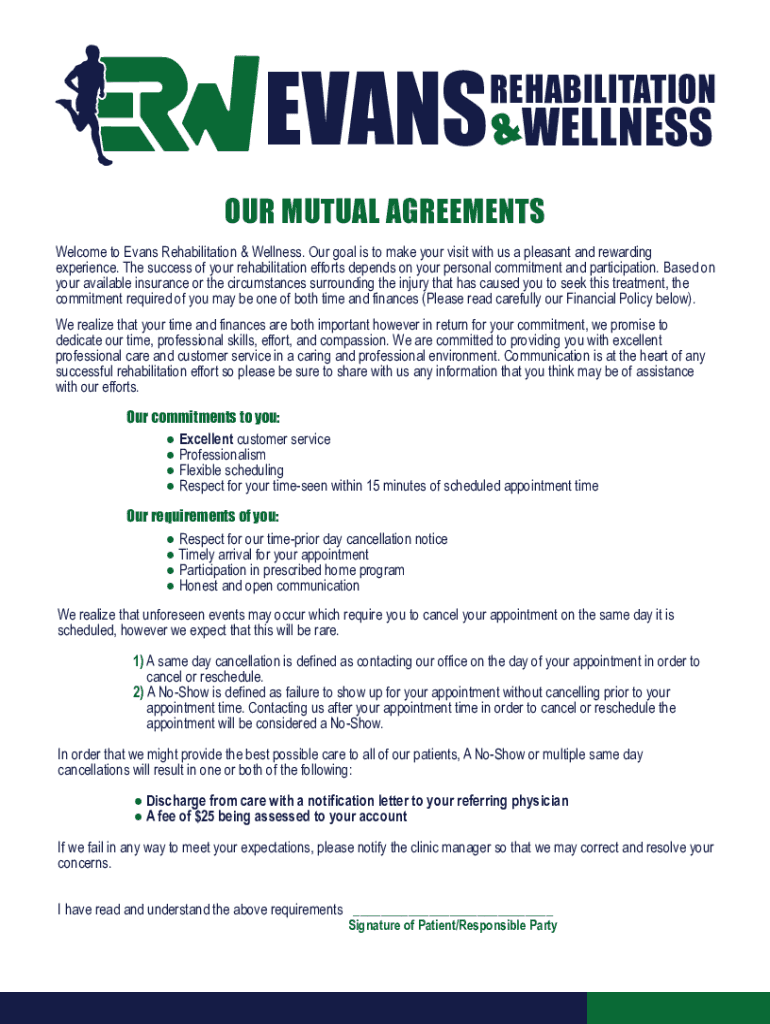 EVANS &WELLNESSREHABILITATIONOUR MUTUAL AGREEMENTS Welcome to Evans Rehabilitation & Wellness. Our goal is to make your visit with us a pleasant and rewarding experience. The success of your rehabilitation