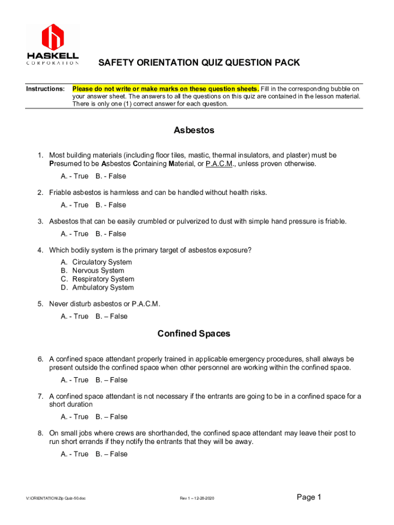 SAFETY ORIENTATION QUIZ QUESTION PACK Instructions:Please do not write or make marks on these question sheets. Fill in the corresponding bubble on your answer sheet. The answers to all the questions