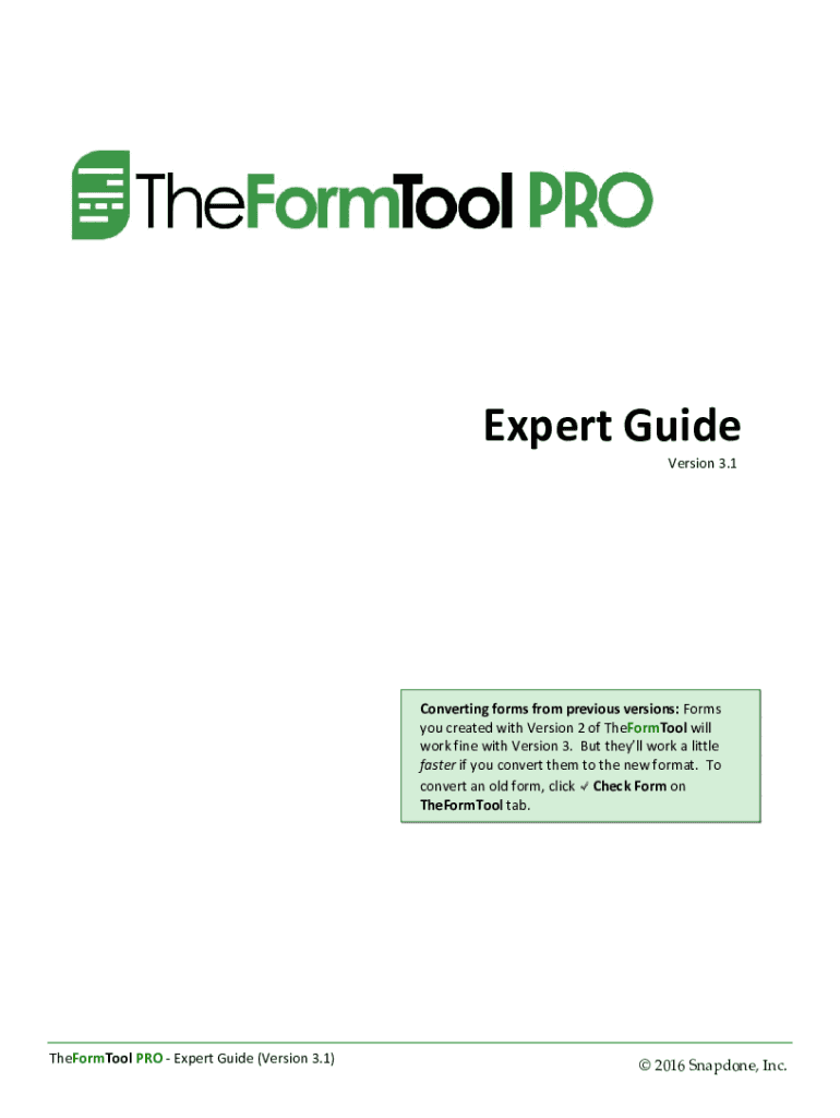 Expert Guide Version 3.1Converting forms from previous versions: Forms you created with Version 2 of TheFormTool will work fine with Version 3. But they'll work a little faster if you convert them
