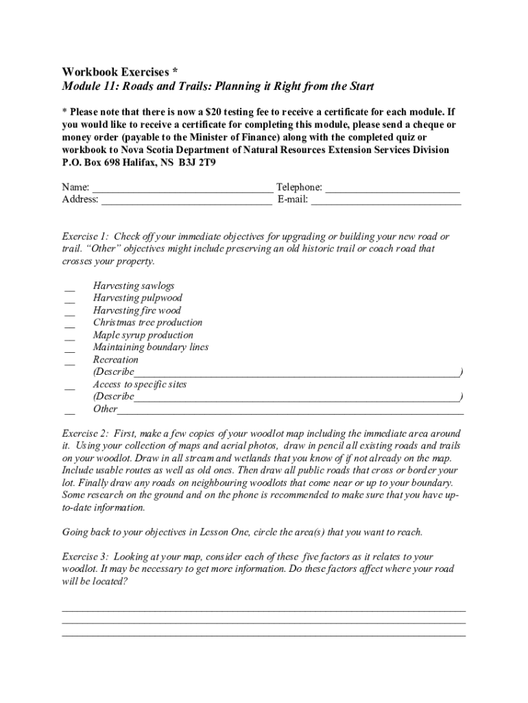Workbook Exercises * Module 11: Roads and Trails: Planning it Right from the Start * Please note that there is now a $20 testing fee to receive a certificate for each module. If you would like to