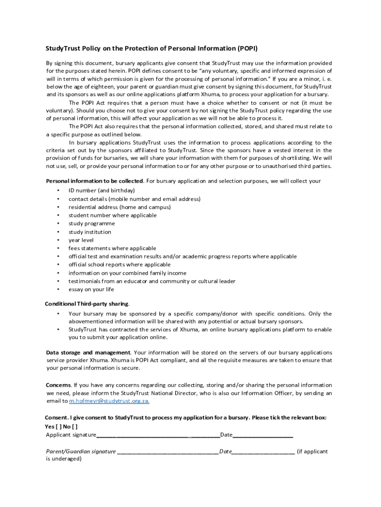 StudyTrust Policy on the Protection of Personal Information (POP) By signing this document, bursary applicants give consent that StudyTrust may use the information provided for the purposes stated