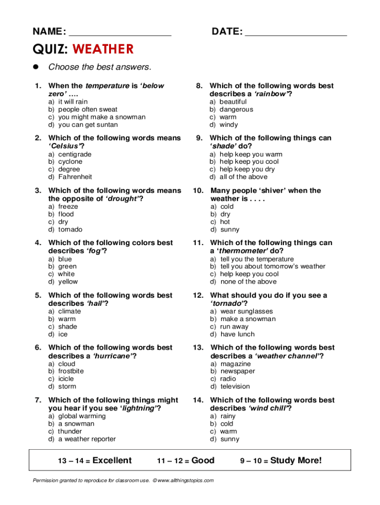 NAME: ___DATE: ___QUIZ: WEATHER Choose the best answers. 1. When the temperature is below zero. a) b) c) d)it will rain people often sweat you might make a snowman you can get Santana) b) c) d)2.