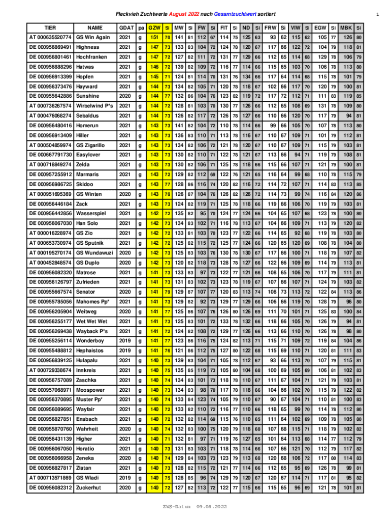 1Fleckvieh Zuchtwerte August 2022 each Gesamtzuchtwert sortie rt TIERNAMEGDAT pa AZW Si MW Sift SiFITSiNDSiFRW Si VIA Si EGG Si MK Seat 000635520774 GS Win Again2021g15170141 81 112 67 114 75 125