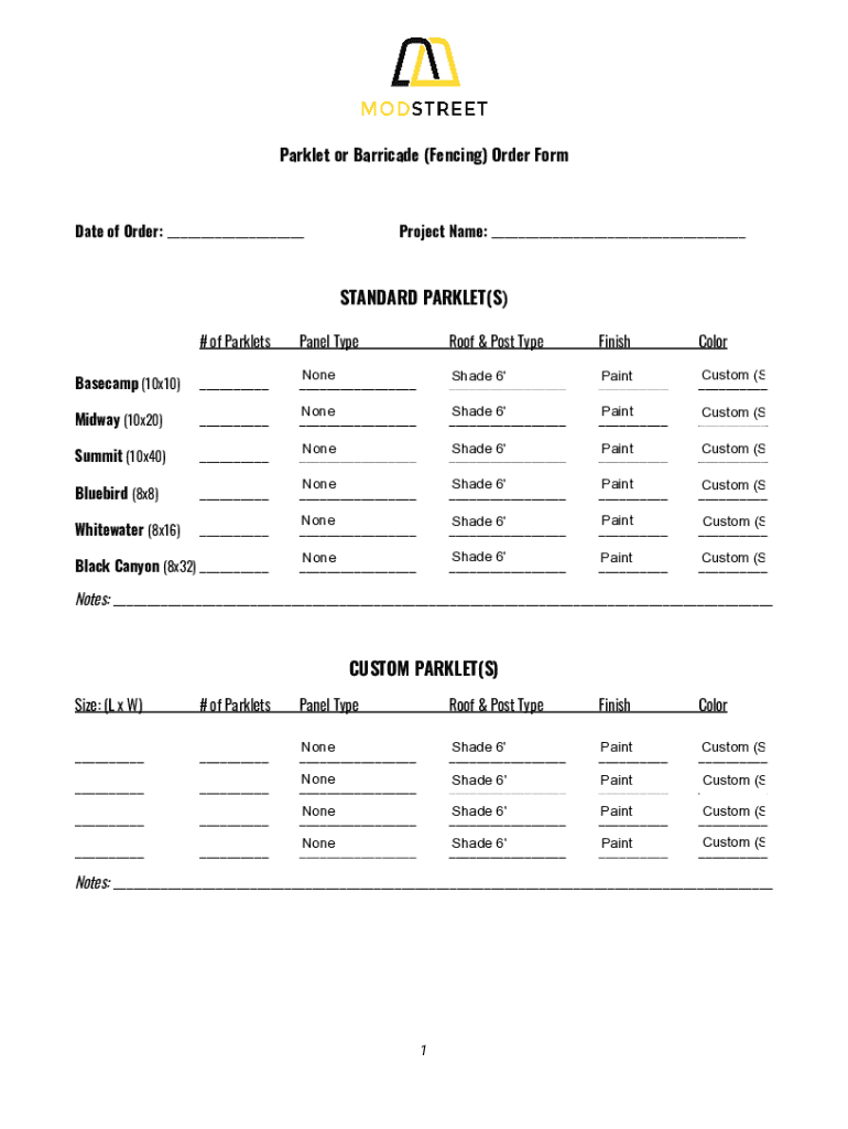 Park let or Barricade (Fencing) Order Format of Order: ___Project Name: ___STANDARD MARKET(S) # of ParkletsPanel TypeBasecamp (10×10)______Midway (10×20)______Summit (10×40)______Bluebird (8×8)______Whitewater