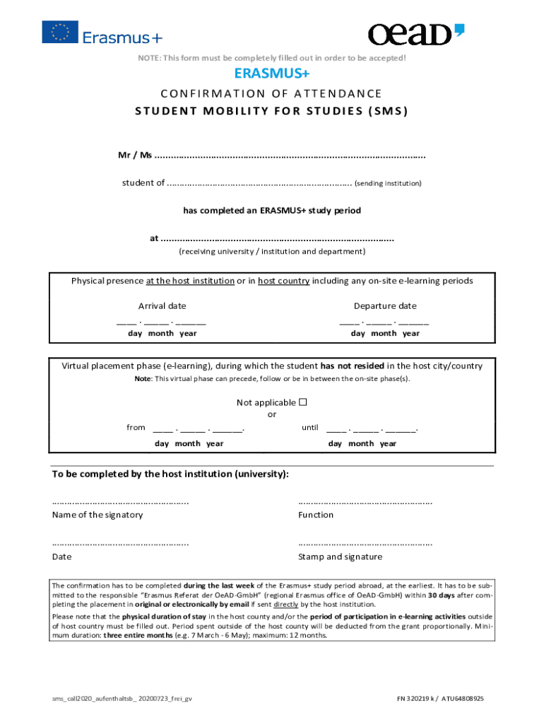 NOTE: This form must be completely filled out in order to be accepted!ERASMUS+ CONFIRMATION OF ATTENDANCE STUDENT MOBILITY FOR STUDIES (SMS)Mr / Ms .....................................................................................................