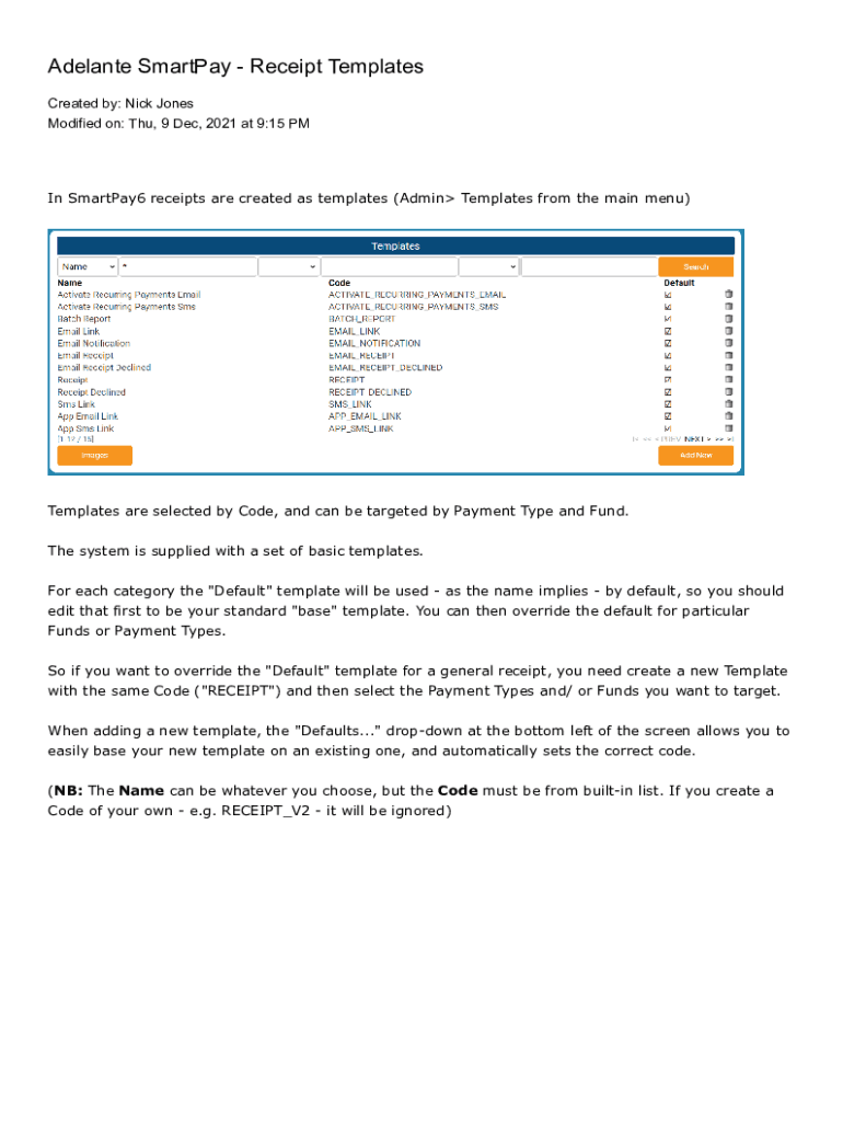 Adelaide Smartly Receipt Templates Created by: Nick Jones Modified on: Thu, 9 Dec, 2021 at 9:15 Pain SmartPay6 receipts are created as templates (Admin Templates from the main menu)Templates are selected