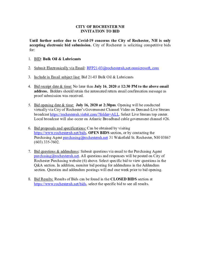 CITY OF ROCHESTER NH INVITATION TO BID Until further notice due to COVID-19 concerns the City of Rochester, NH is only accepting electronic bid submission. City of Rochester is soliciting competitive