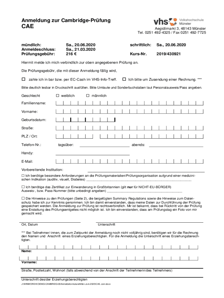 Amending our CambridgePrfungCAEAegidiimarkt 3, 48143 Master Tel. 0251 4924325 / Fax 0251 4927725mndlich: Anmeldeschluss: Prfungsgebhr:SA., 20.06.2020 SA., 21.03.2020 216 schriftlich:SA., 20.06.2020KursNr.2019/430921Hiermit