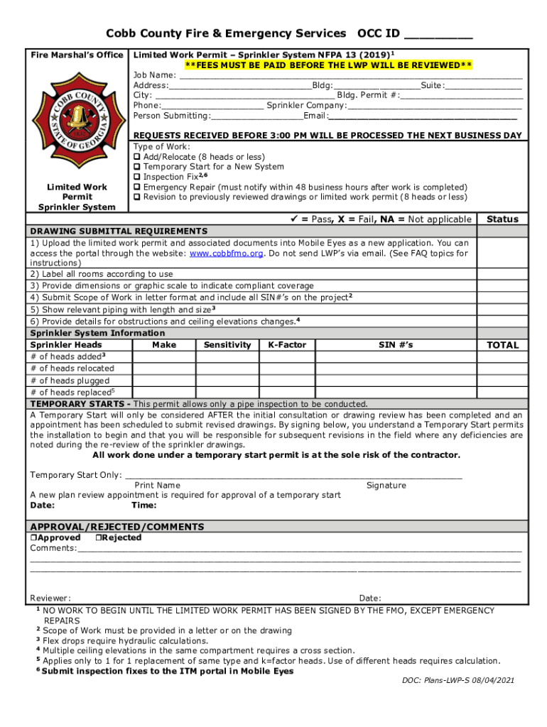 Cobb County Fire & Emergency Services Fire Marshals OfficeLimited Work Permit Sprinkler System OCC ID ___Limited Work Permit Sprinkler System NFPA 13 (2019)1 **FEES MUST BE PAID BEFORE THE LAP WILL