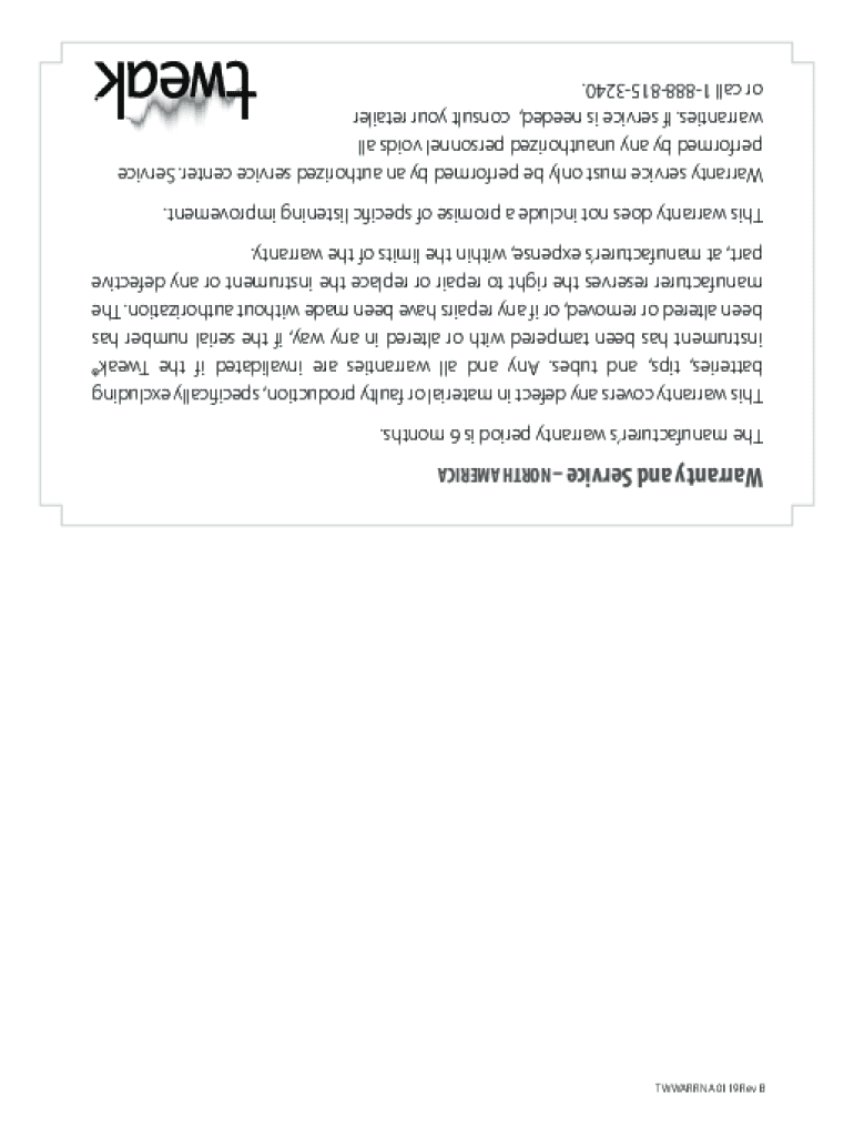 TW WAR RNA 0119 Rev Warranty and Service NORTH AMERICA The manufacturers warranty period is 6 months. This warranty covers any defect in material or faulty production, specifically excluding batteries,