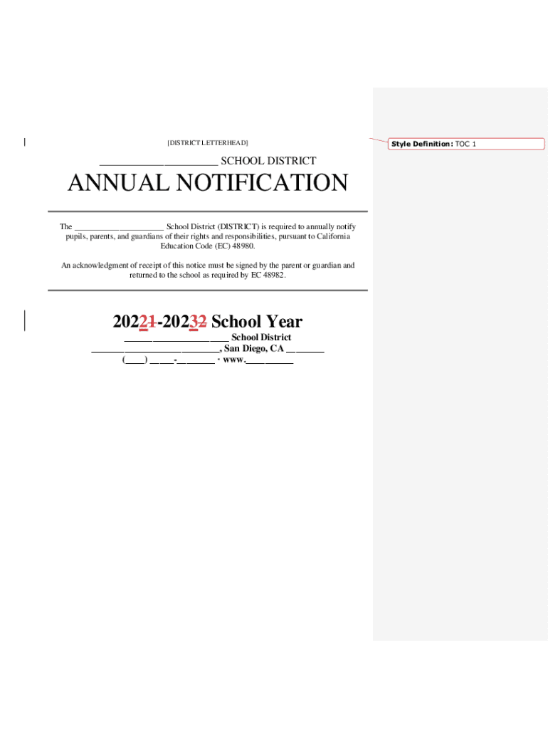 [DISTRICT LETTERHEAD]___ SCHOOL DISTRICTANNUAL NOTIFICATION The ___ School District (DISTRICT) is required to annually notify pupils, parents, and guardians of their rights and responsibilities, pursuant