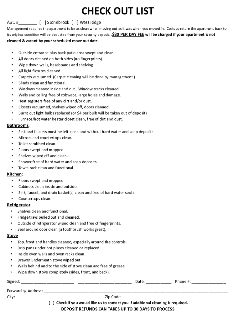 CHECK OUT LIST Apt. #___ [ ] Stone brook [ ] West Ridge Management requires the apartment to be as clean when moving out as it was when you moved in. Costs to return the apartment back to its original