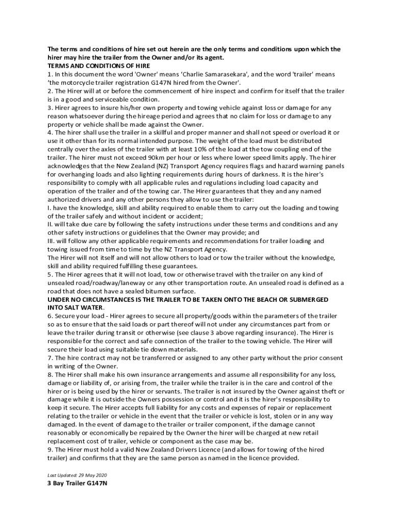 The terms and conditions of hire set out herein are the only terms and conditions upon which the hired may hire the trailer from the Owner and/or its agent. TERMS AND CONDITIONS OF HIRE 1. In this