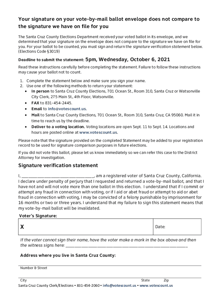 Your signature on your votebymail ballot envelope does not compare to the signature we have on file for you The Santa Cruz County Elections Department received your voted ballot in its envelope, and