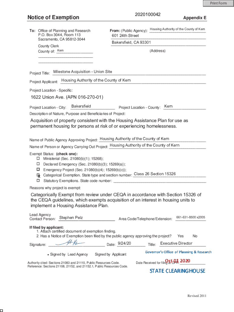 Print Form2020100042Notice of ExemptionAppendix Housing Authority of the County of Kern From: (Public Agency): ___To: Office of Planning and Research P.O. Box 3044, Room 113 Sacramento, CA 958123044601