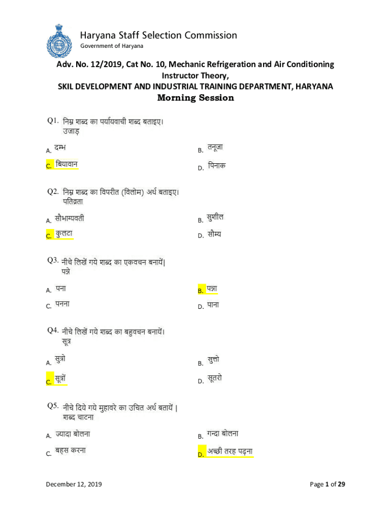 Adv. No. 12/2019, Cat No. 10, Mechanic Refrigeration and Air Conditioning Instructor Theory, SKIN DEVELOPMENT AND INDUSTRIAL TRAINING DEPARTMENT, HARYANA Morning Session Q1. A.B.C.D. Q2. A.B.C.D.