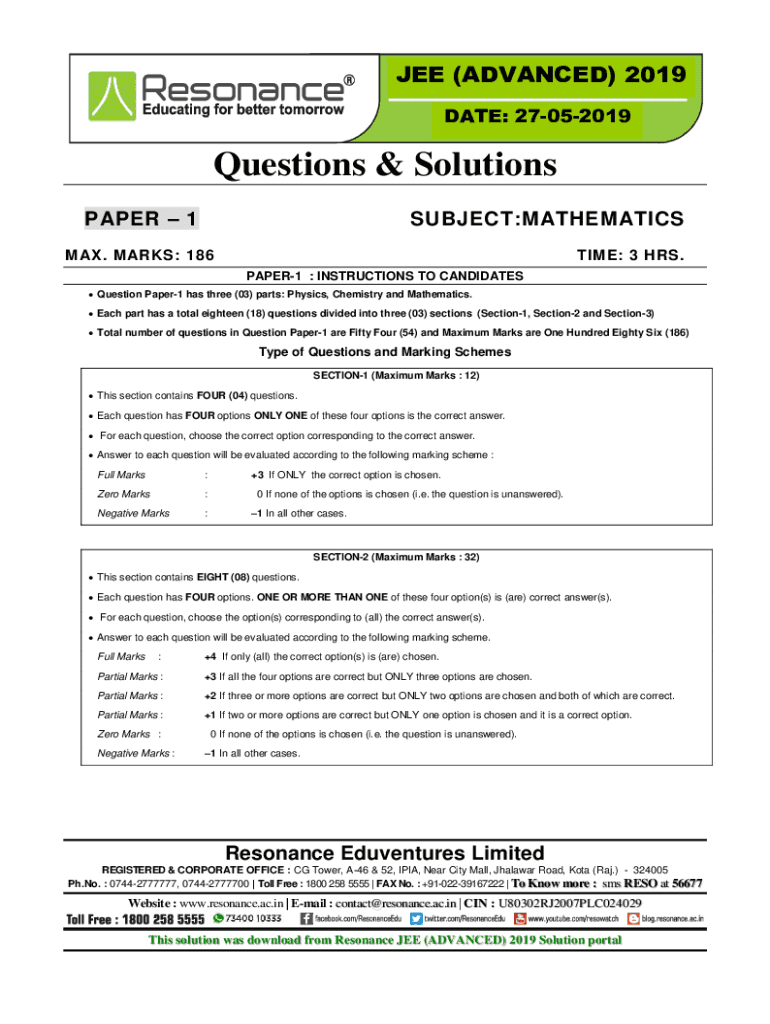 SEE (Advanced) (ADVANCED) 2016 2019 JEE22052016DATE: 27052019Questions & Solutions PAPER 1SUBJECT:MATHEMATICAL. MARKS: 186TIME: 3 HRS. PAPER1 : INSTRUCTIONS TO CANDIDATES Question Paper1 has three
