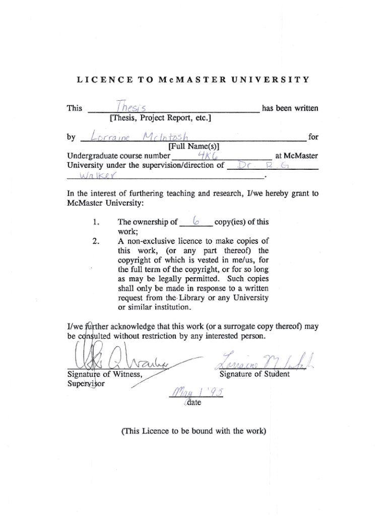 License TO McMaster UNIVERSITY This__L.f. h. . E;’s;: :; L(5. . Has been written [Thesis, Project Report, etc.]11 ctn ms for [Full Name(s)] Undergraduate course number _ ___. Of.! Kl....LC f :::::
