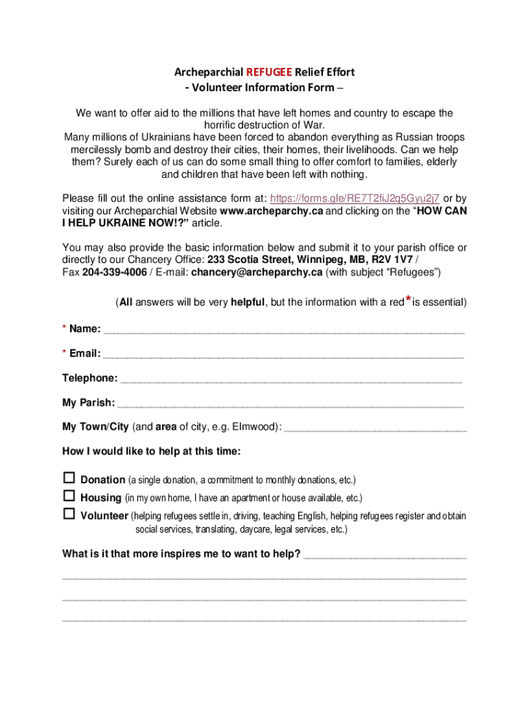 Archeparchial REFUGEE Relief Effort Volunteer Information Form We want to offer aid to the millions that have left homes and country to escape the horrific destruction of War. Many millions of Ukrainians