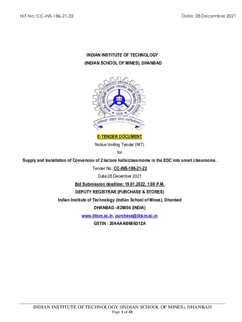 NIT No. CCINS1862122Date: 28 December 2021INDIAN INSTITUTE OF TECHNOLOGY (INDIAN SCHOOL OF MINES), DHANBADETENDER DOCUMENT Notice Inviting Tender (NIT) for Supply and Installation of Conversion of